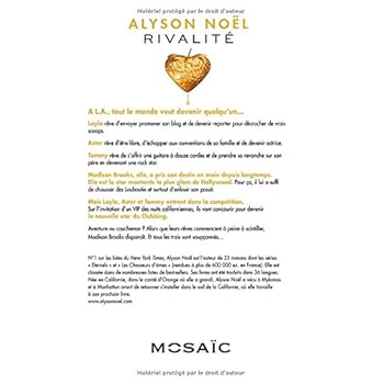 « un roman addictif » « Rivalité est un roman addictif. Des rebondissements à chaque page et un cliffhangher génial. » Anna Todd auteur de la série « AFTER », best-seller mondial. A L.A., tout le monde veut devenir quelqu’un…Layla Harrison rêve d’envoyer promener son blog et de devenir reporter pour décrocher de vrais scoops.Aster rêve d’être libre, d’échapper aux conventions de sa famille et de devenir actrice.Tommy rêve de s’offrir une guitare à douze cordes et de prendre sa revanche sur son père en devenant une rock star.Madison Brooks, elle, a pris son destin en main depuis longtemps. Elle est la star montante la plus glam de Hollywood. Pour ça, il lui a suffi de chausser des Louboutin et surtout d’enfouir son passé.Mais Layla, Aster et Tommy entrent dans la compétition. Sur l’invitation d’un VIP des nuits californiennes, ils vont concourir pour devenir la nouvelle star du Clubbing.Aventure ou cauchemar ? Alors que leurs rêves commencent à peine à scintiller, Madison Brooks disparaît. Et tous les trois sont soupçonnés… On en parle« Rivalité vous happera dès les premières pages. C’est de l’or pur. » Jamie McGuire auteur du roman Beautiful Disaster« Telle une star, Rivalité est un livre mystérieux, fascinant, et si magnifique que vous ne pourrez pas en détourner le regard. » Cecily von Ziegesar, auteur de la série Gossip Girl. A propos de l’auteurN°1 sur les listes du New York Times, Alyson Noël est l’auteur de 23 romans dont les séries « Eternels » et « Les Chasseurs d’âmes » (vendues à plus de 600 000 ex. en France). Elle est classée dans de nombreuses listes de best-sellers. Ses livres ont été traduits dans 36 langues. Née en Californie, dans le comté d’Orange où elle a grandi, Alyson Noël a vécu à Mykonos et à Manhattan avant de retourner s’installer dans le sud de la Californie, où elle travaille à son prochain livre. www.alysonnoel.com